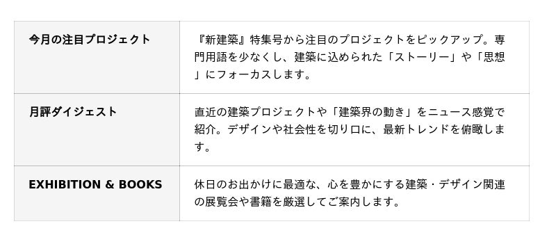 また、本チャンネルのターゲットには、建築業界だけでなく、デザイン、アート、ファッションに関心を持つ高感度なカルチャー層を設定。建築誌の多岐にわたる最新情報を、聴きやすい構成に凝縮し、「建築誌を耳で楽しむ」という新しいカルチャーコンテンツを確立します。