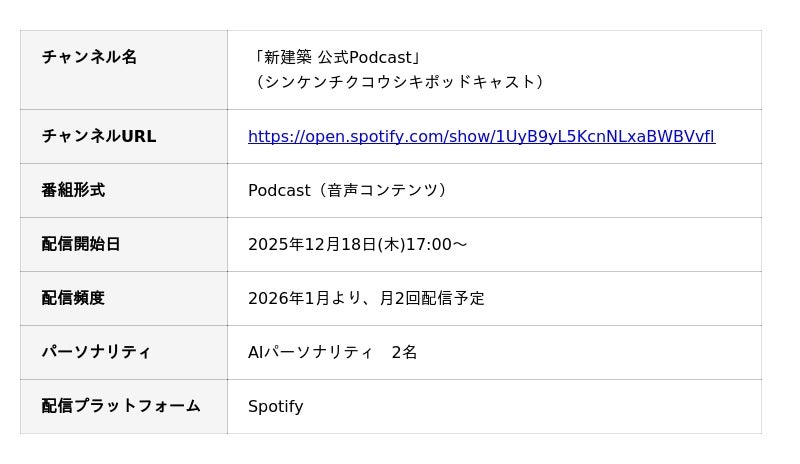 株式会社新建築データ(本社:東京都千代田区、代表取締役社長: 吉田信之)は、建築専門誌『新建築』創刊100周年の節目となる今年、『新建築』のコンテンツをベースにしたAIパーソナリティによる「新建築 公式Podcast」を、2025年12月18日(木)よりSpotifyにて配信開始いたします。
