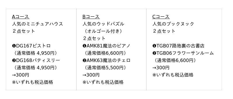 内容は『つくるんです(R)』の中でも人気の高いミニチュアハウスやウッドパズル、ブックヌックの各2点セット。高品質で人気のDIYキットが、超特価で手に入るまたとない機会です。