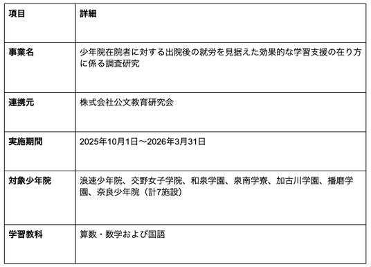 - 対象少年院7施設における、公文教育研究会が指定する少年(対象者)への公文式学習を用いた学習支援業務 。