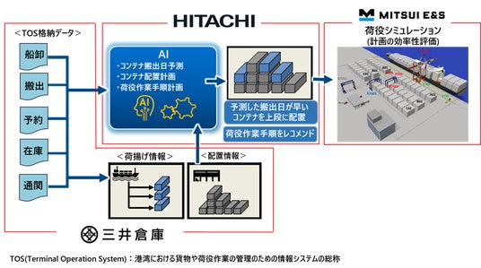 株式会社三井E&S(以下、三井E&S)と三井倉庫株式会社(以下、三井倉庫)、株式会社日立製作所(以下、日立)の三社は、2023年に、国土交通省が実施する港湾技術開発制度における技術開発業務*1(令和5年度~令和7年度)を受託*2し、港湾におけるAIを活用したコンテナターミナル運営の効率化技術の開発に取り組んでいます。そして、2025年11月から、三井倉庫が運営する神戸港六甲RC2コンテナターミナル(兵庫県神戸市)において、現地実証を開始したことをお知らせいたします。現地実証では、三井倉庫が有するコンテナターミナル運営のノウハウを活用しながら、コンテナ貨物の特性データをもとに日立のAIが立案した搬出日予測、コンテナ配置計画、荷役作業手順計画*3を、三井E&Sが開発した荷役シミュレーターを用いて効率性を検証・評価したうえで、実際の作業に一部適用します。現地実証は2026年2月まで実施する予定です。