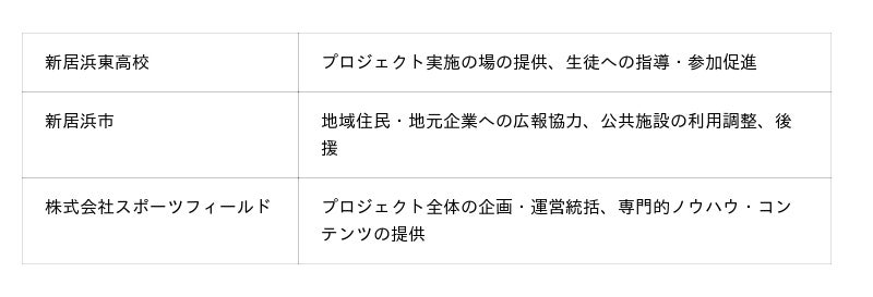 新居浜東高等学校では、愛媛県内の県立高校として初めて「健康スポーツ科」を設置しており、生徒の競技力向上とキャリア形成支援の必要性が高まっています。また新居浜市は、スポーツを通じた地域活性化、若者の地元定着、シビックプライドの醸成を目指しています。