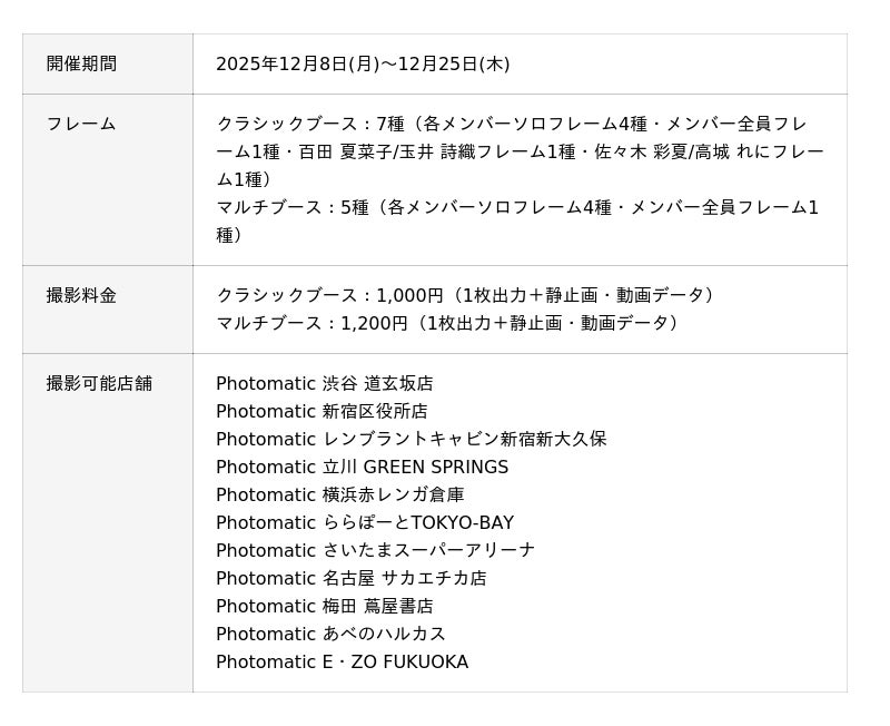キタムラ・ホールディングス グループのピックハイブ株式会社(本社:東京都新宿区、代表取締役社長兼COO:大迫 由典)が運営するセルフフォトブランド「Photomatic(フォトマティック)」は、2025年12月8日(月)から2025年12月25日(木)の期間中、「ももいろクローバーZ」(以下、ももクロ)との初のコラボレーションを実施いたします。