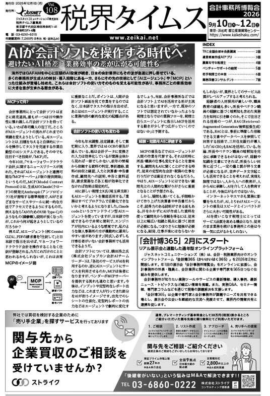 今号は、生成AIの進化の次の波である「AIエージェント」と、この実現を加速する規格「MCP」が会計事務所にもたらす劇的な業務変革を特集。定型業務がAIに代替される時代における、人材育成、組織運営、そして顧問先支援の新たな戦略に迫ります。