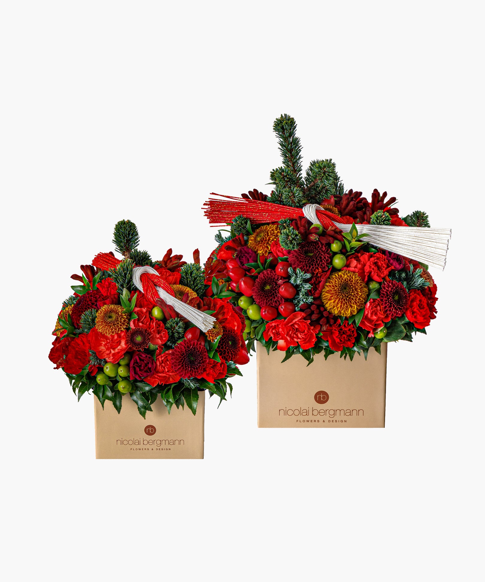 ニューイヤー限定フレッシュフラワーキューブ「New Year Cube - Akane(ニューイヤーキューブ - アカネ)」S(φ18×H17cm)12,100円 / M(φ21×H20cm)18,700円 ※オンラインショップのみ12/26-12/30着よりお届け日をご選択いただく予約受付になります。