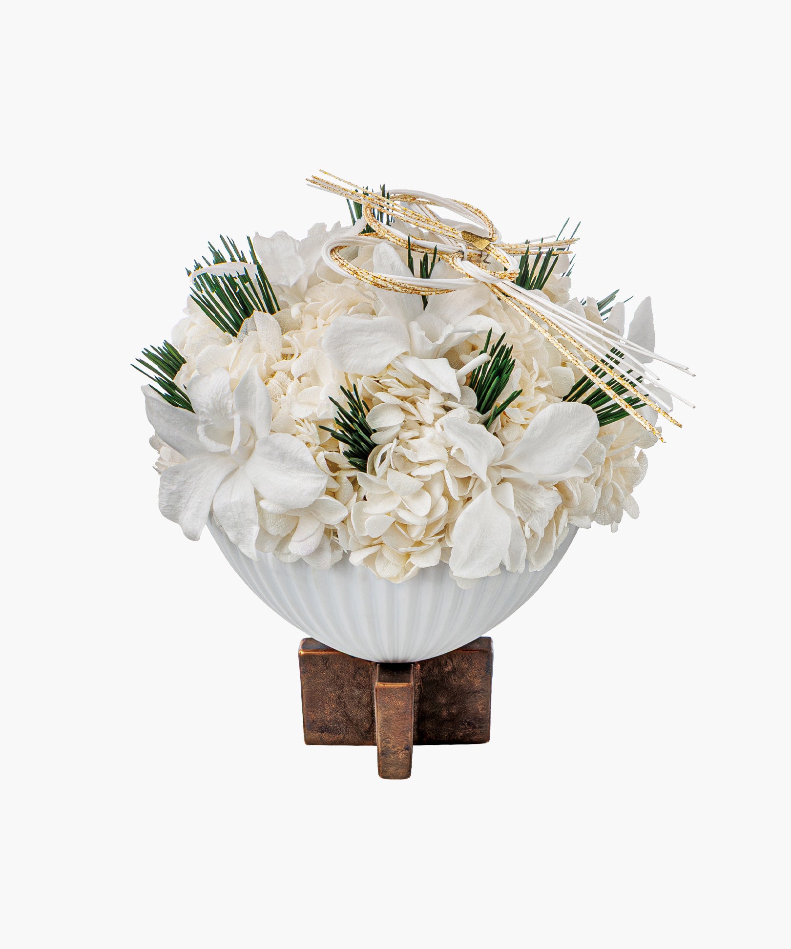 ニコライ バーグマンオリジナルの菊をモチーフにした有田焼クリサンサマムベースにアレンジしたプリザーブドフラワーアレンジメントは、ホワイトの紫陽花やデンファレに松のグリーンが映え、ホワイトゴールドの水引が清らかな輝きを添え、お正月らしい表情に仕上げています。やわらかな色合いと凛とした佇まいが器の優美なフォルムと響き合い、季節を超えて長く楽しめます。