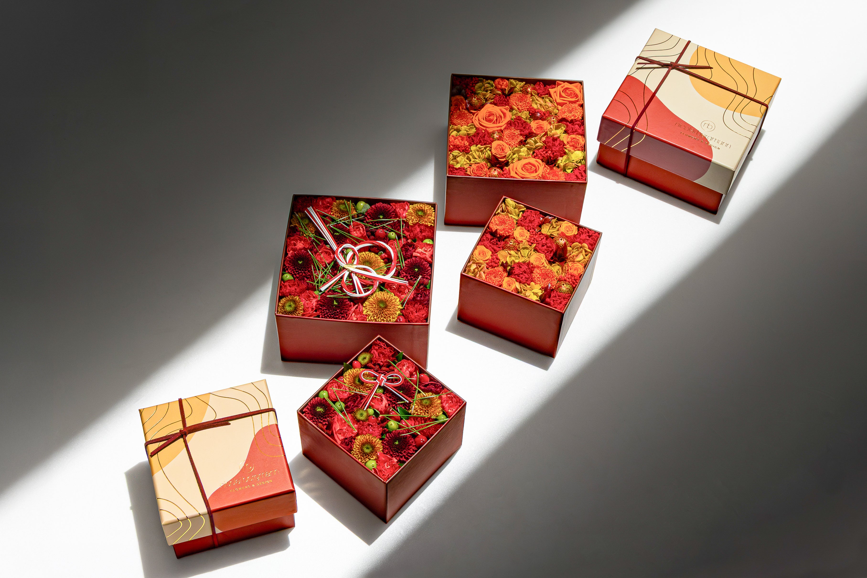 黄金色の有機的なラインをまとわせた華やかなフラワーボックスは、朱赤の深みと流れるような曲線が重なり、新しい一年を鮮やかに照らします。上品で明るいデザインの蓋を開けると、色鮮やかであたたかい印象を与えるフラワーデザインが目一杯に広がります。落ち着きの中に凛とした華やぎが宿る、年のはじまりにふさわしい多数のフラワーアイテムを、フレッシュフラワー、プリザーブドフラワーでご用意しています。年末年始のギフトや新年のご挨拶にぴったりな、特別なニューイヤーコレクション2026をぜひお楽しみください。