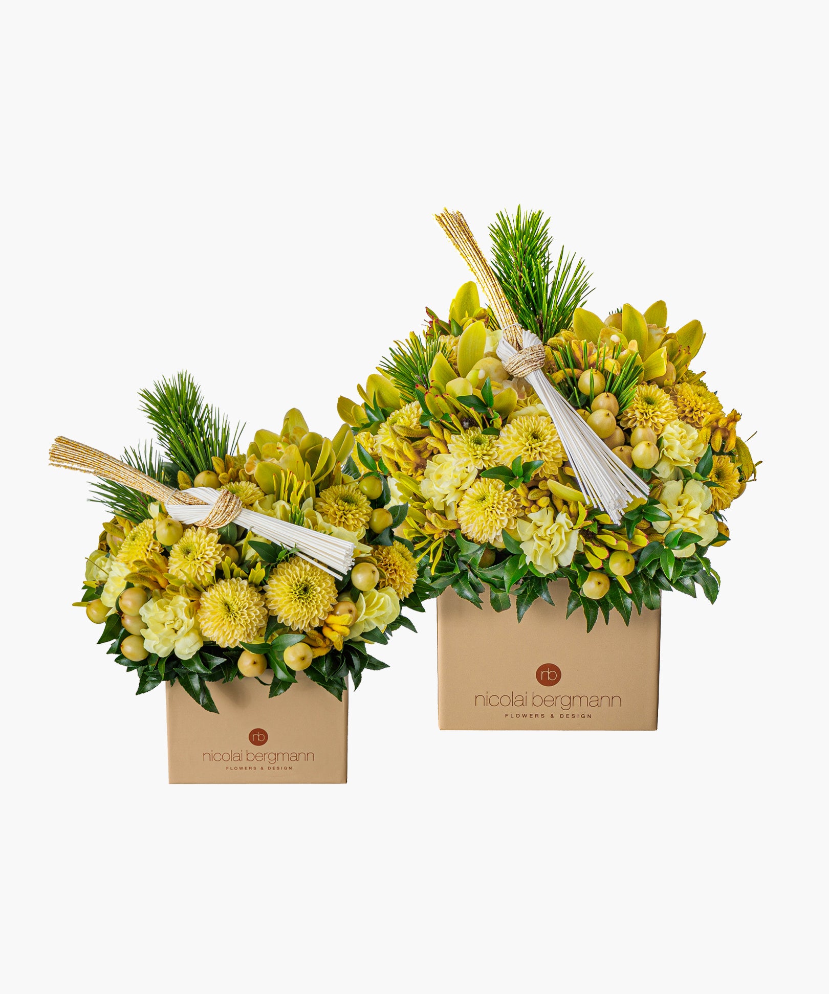 ニューイヤー限定フレッシュフラワーキューブ「New Year Cube - Kogane(ニューイヤーキューブ - コガネ)」S(φ18×H17cm)12,100円 / M(φ21×H20cm)18,700円 ※オンラインショップのみ12/26-12/30着よりお届け日をご選択いただく予約受付になります。