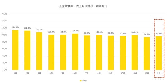 - 1月度の前年対比の売り上げ伸長率は、前月から2.1pt増加した。売り上げは前年対比96.7%で、マイナスとなった。