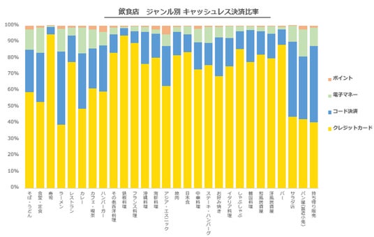 - ジャンル別に見ると、28ジャンル中15ジャンルでキャッシュレス比率が50%を超える。また、コード決済比率が高いサラダ店では、その比率が20%を超える。
