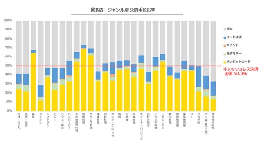 - ジャンル別に見ると、28ジャンル中15ジャンルでキャッシュレス比率が50%を超える。