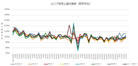 - 1月売上における、前年対比の伸長率(地方平均)は98.4%と前月から2.2pt増加した。地域別では、北海道地方が最も高く前年対比105.2%となった。