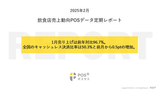 「はたらいて、笑おう。」をビジョンに掲げるパーソルグループでクラウド型モバイルPOSレジの「POS+(ポスタス)」を提供するポスタス株式会社(本社:東京都中央区、代表取締役社長:本田 興一、以下:ポスタス)は、2025年1月度の飲食店売上動向についてPOSデータを基に集計し、結果をとりまとめましたので本日公開します。