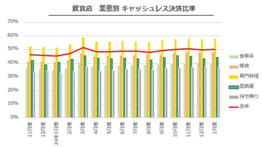 - キャッシュレス決済比率は、食事系・持ち帰り以外の業態で12月度から1月度にかけて増加した。専門料理は58.0%と業態の中で一番比率が高い。また、12月度から1月度にかけて、すべての業態でコード決済比率が増加した。