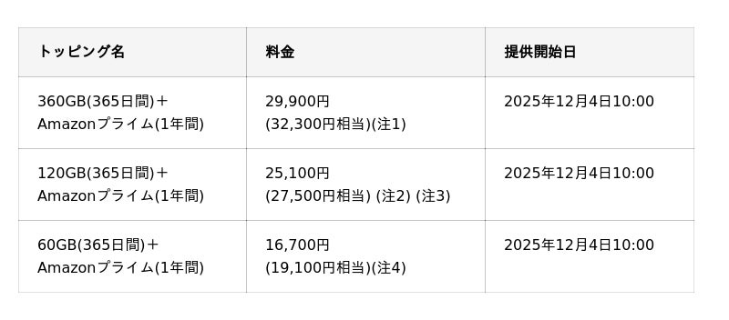 KDDI、沖縄セルラーは2025年12月4日から、povo2.0の「いつものトッピング」として、「360GB(365日間)」「120GB(365日間)」「60GB(365日間)」の1年間トッピング3種について、「Amazonプライム(1年間)」がセットで2,400円おトクなトッピングを新たに提供します。