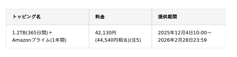 あわせて、「今だけのトッピング」の「1.2TB(365日間)」に「Amazonプライム(1年間)」がセットになったトッピングを2026年2月28日までの期間限定で提供します。