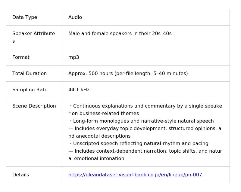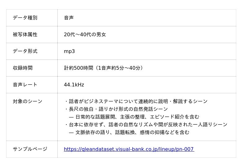 Visual Bank株式会社(東京都港区、代表取締役CEO 永井真之、以下「Visual Bank」)は、傘下の株式会社アマナイメージズを通じて展開するAI学習用データソリューション『Qlean Dataset(キュリンデータセット)』において、『日本語・1話者・ビジネステーマトーク音声コーパスデータセット』の提供を開始しました。本データセットは、20代~40代の男女話者による長尺の日本語音声を収録しており、音声認識(ASR)、自然言語処理(NLP)、対話モデル、生成AI基盤開発などの研究・実装に活用できます。