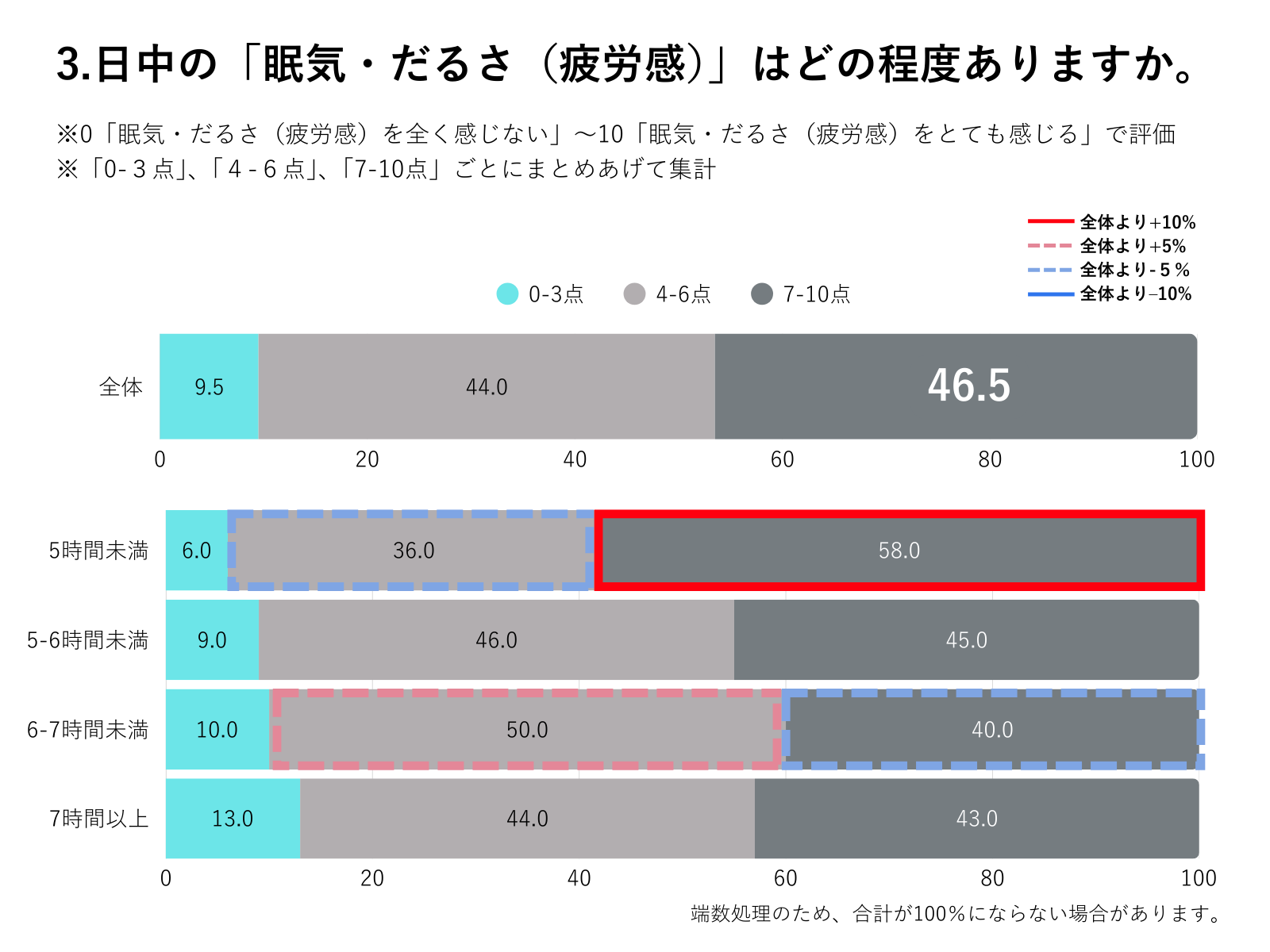 日中の眠気・だるさを10段階で聞くと、7-10点と答えた人は全体で46.5%、4-6点は44.0%と、ほぼ二分する結果になりました。特に5時間未満のグループでは、7-10点と答えた割合が58.0%と、他のグループと比べて日中の眠気・だるさを感じている層が多いことが分かりました。