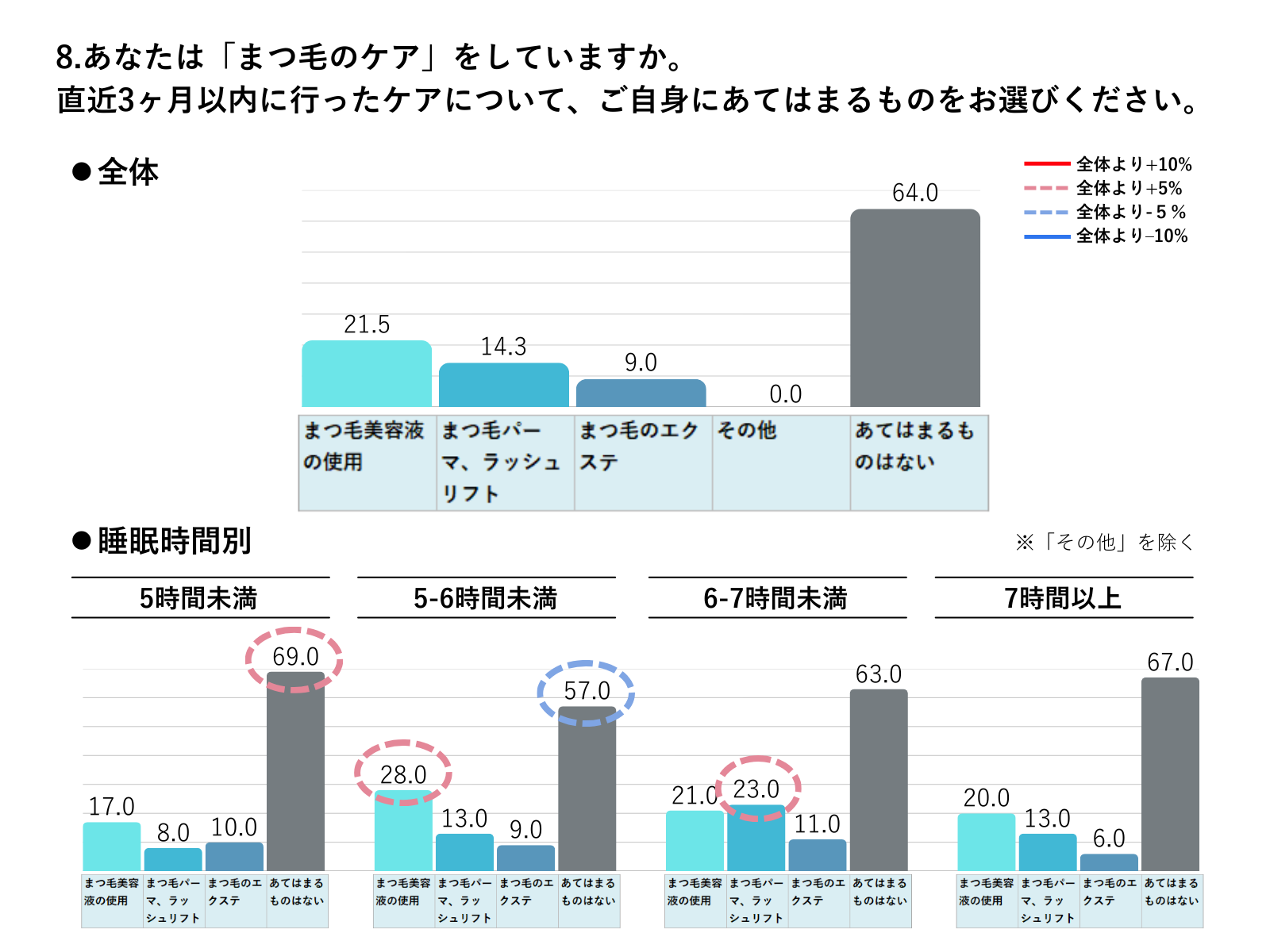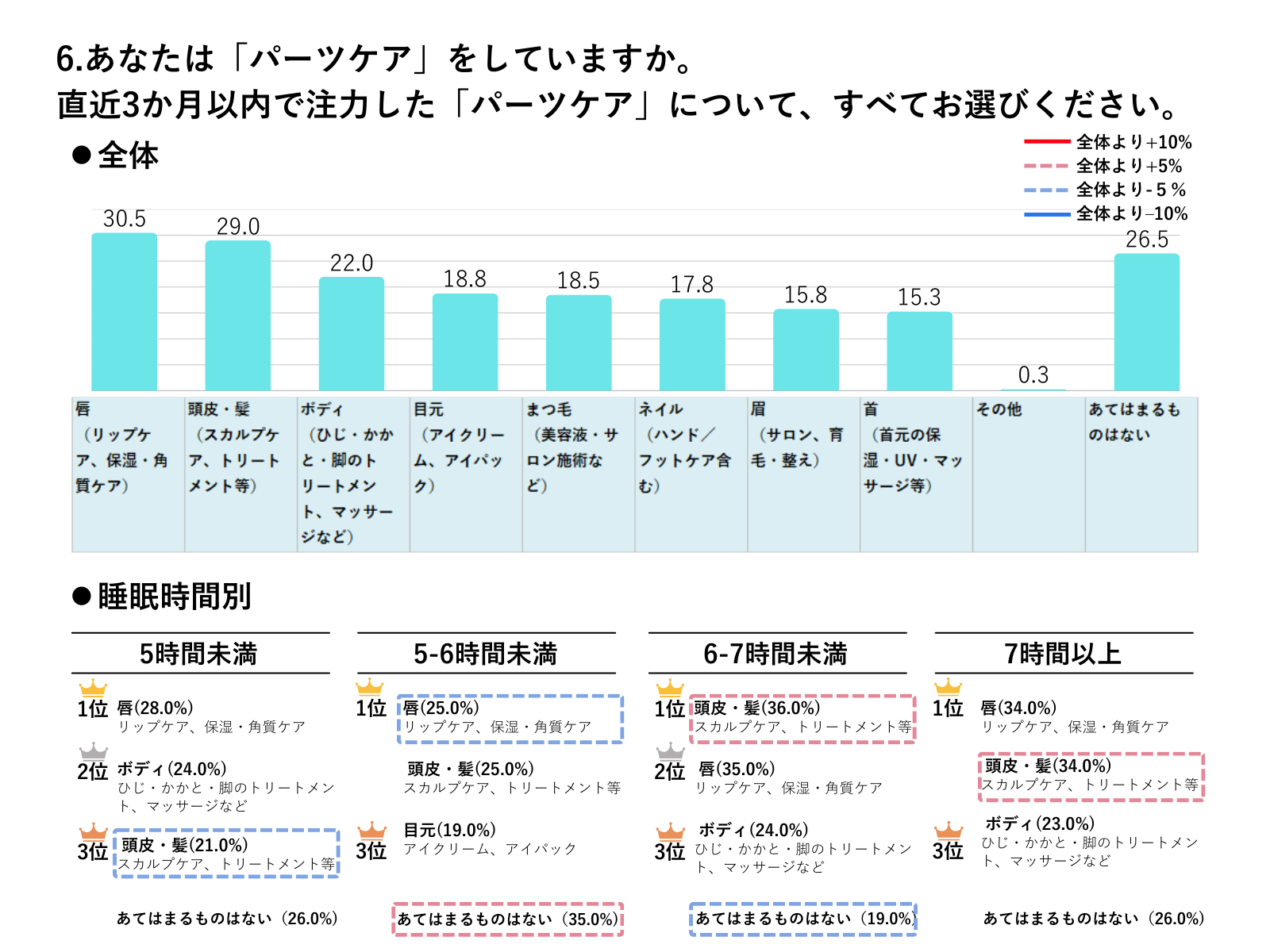 ・平均睡眠時間が6~7時間の人は、美容への注力度が最も高く、パーツケアにも注力