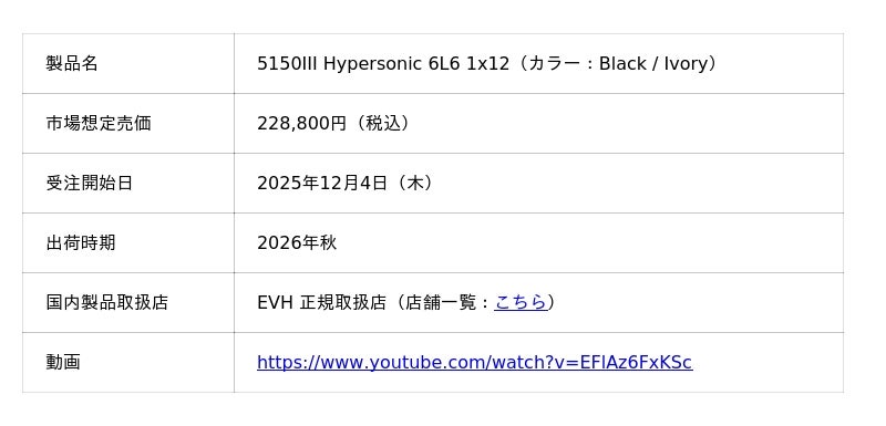 フェンダー ミュージカル インストゥルメンツ コーポレーション(所在地:米国カリフォルニア州、CEO:アンディ・ムーニー、以下FMIC)は、エレキギター/アンプブランドEVH(R)︎より、デジタルアンプ の新製品『5150III Hypersonic 6L6 1x12』 を発表しました。国内では、受注生産となり、2025年12月4日(木)より正規取扱店にて受注を開始し、2026年秋にお届け予定です。