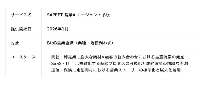 営業組織の“時間がない”を解消し、目標達成への最短ルートをAIがナビゲート「SAPEET 営業AIエージェント」β版 2026年1月より提供開始