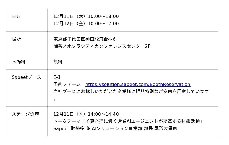 Sapeetは、12月11日(木)・12月12日(金)に開催される「AIエージェント博 by AI博覧会」に出展します。ブースでは「SAPEET 営業AIエージェント」によって営業組織の一日がどう変わるのかがわかるデモを初お披露目します。さらに当日、ブース(要予約)にお越しくださった企業ご担当者様には、特別プランのご案内が可能です。数には限りがございますので予めご了承ください。