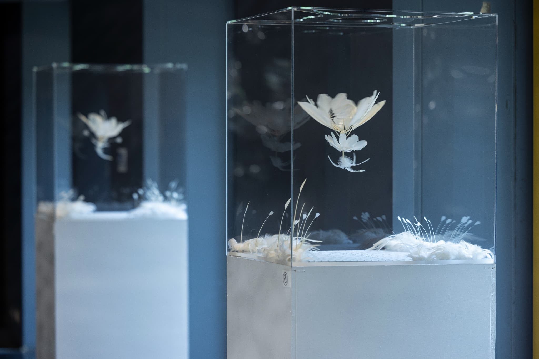 2004年、美術大学の卒業制作で羽根を浮かせたことをきっかけに、