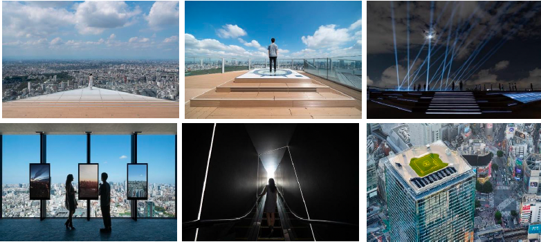 本施設は、14階~45階の移行空間「SKY GATE」、日本最大級の屋上展望空間「SKY STAGE」、46階の屋内展望回廊「SKY GALLERY」の3つのゾーンで構成されております。渋谷最高峰の地上229mから広がる360度の景色を眺めるにとどまらず、一連の体験を通じて知的好奇心を刺激し、想像力を育む展望装置です。