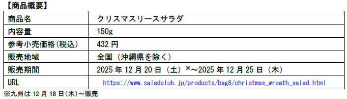 株式会社サラダクラブ(代表取締役社長:新谷昭人、本社:東京都調布市)は、2025年12月20日(土)※~12月25日(木)までの期間限定で、「クリスマスリースサラダ」(150g/税込432円)を全国(沖縄県を除く)で発売します。
