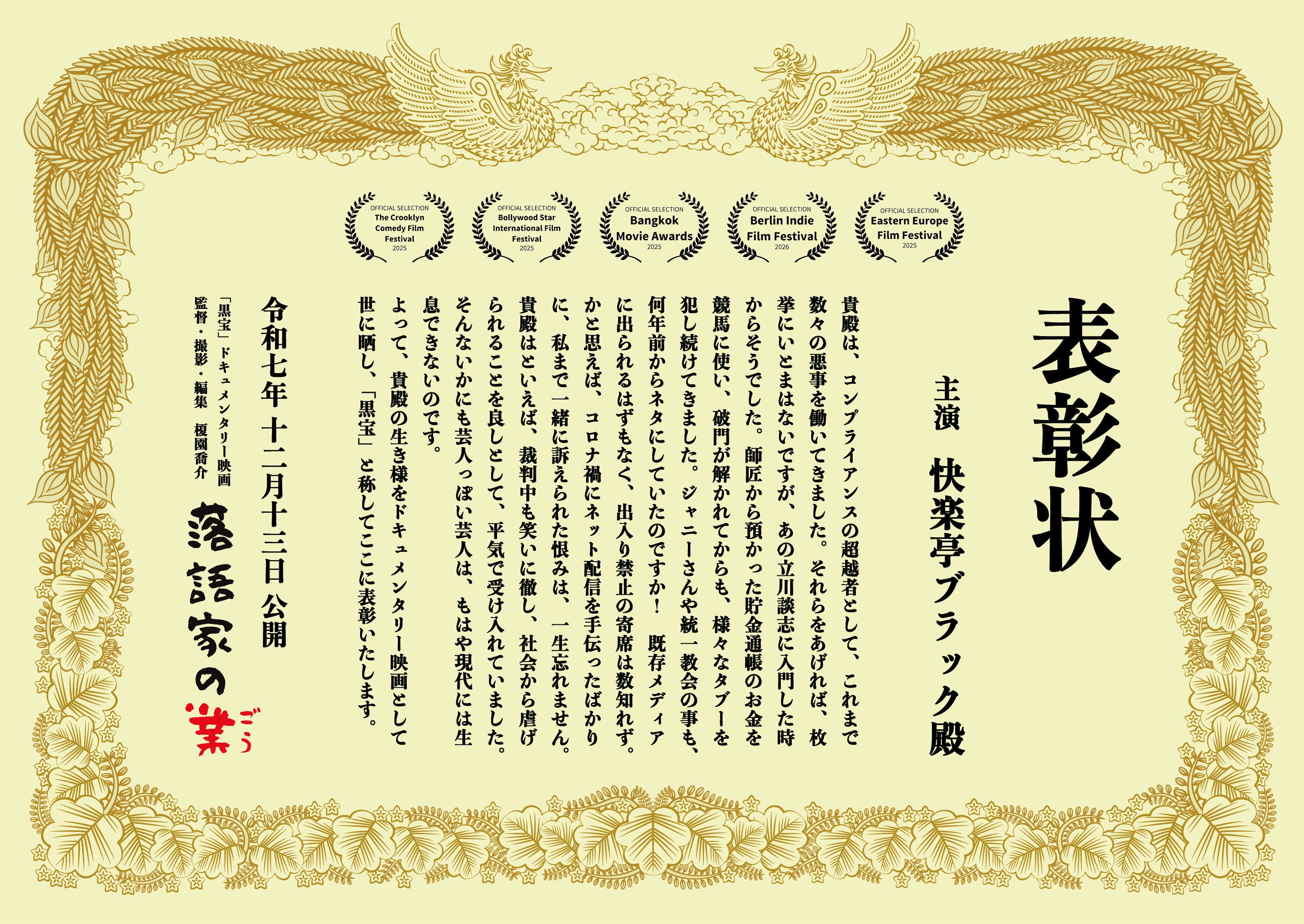 「落語とは、人間の業の背定である」との名言を残す、落語界のカリスマ・立川談志の弟子であり、その言葉を体現するかのような破滅的な生活と過激な落語で、メディアへの露出が限定的な中、長年の間、根強い人気を誇る落語家・快楽亭ブラック。
