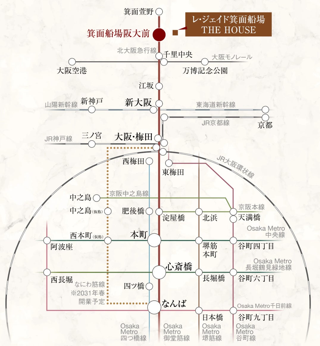 当物件は、御堂筋線に直通する北大阪急行線「箕面船場阪大前」駅まで徒歩5分の場所に位置し、「新大阪」「梅田」「なんば」へダイレクトアクセスが可能な交通利便性の高い立地です。また、鉄道を1回の乗り換えで「大阪空港」「関西国際空港」へアクセスできるほか、中国自動車道や名神高速道路、新名神高速道路、近畿自動車道といった高速道路ネットワークを柔軟に利用できるため、県内外への移動にも優れています。