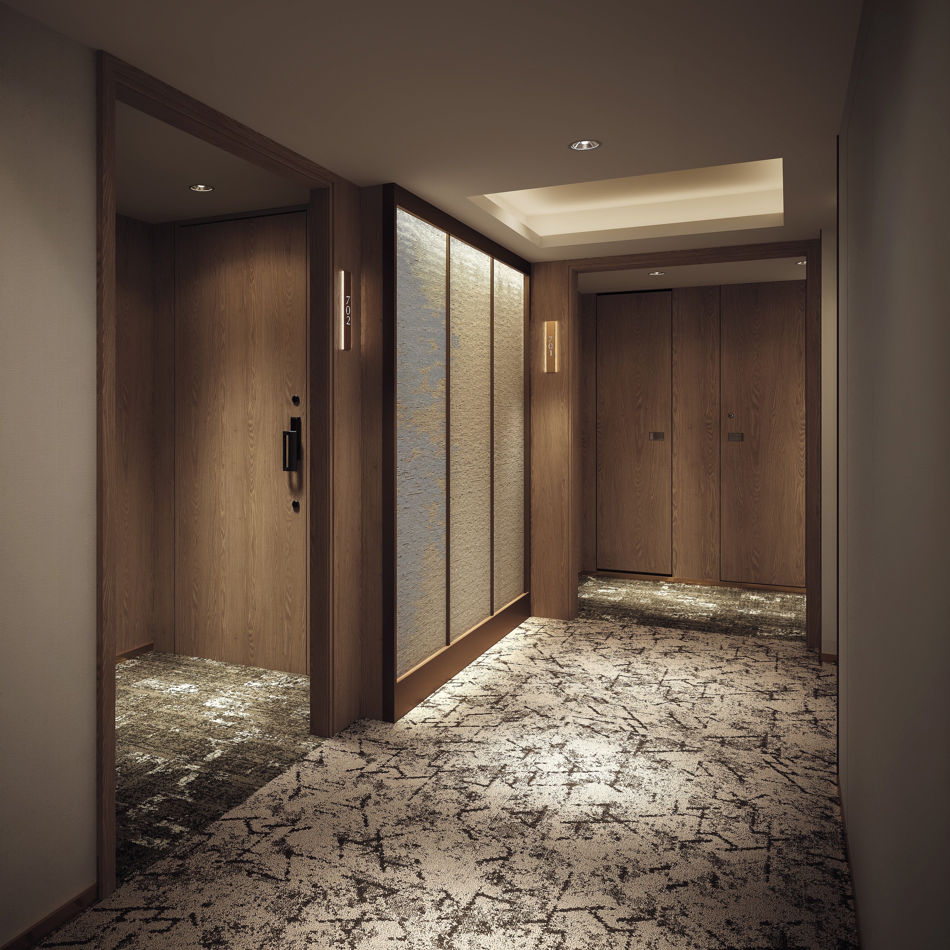 エントランスアプローチには、テラコッタタイルと相性のよいオリーブをメインとした、存在感のあるカラーリーフを植栽し、安らぎと清浄感のある迎賓の空間を創出しました。またラウンジは、繊維の街にちなんだ織り感のある素材をはじめ、透け感や起伏に富んだリブガラスや、オーク材の化粧パネルなど、吟味されたマテリアルにより、邸宅にふさわしいくつろぎを演出します。