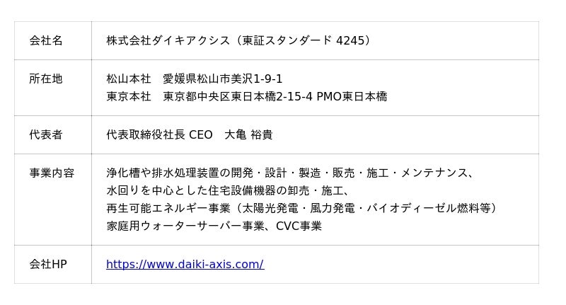 株式会社ダイキアクシス(本社:愛媛県松山市、代表取締役社長:大亀 裕貴)の100%子会社である株式会社ダイキアクシス・サステイナブル・パワー(本社:東京都中央区、代表取締役:堀淵 昭洋)は、2025年12月5日(金)~2026年1月31日(土)に開催される『目黒川みんなのイルミネーション2025』へ協賛するとともに、近隣企業等からの使用済み食用油の回収、およびイルミネーションの燃料として高品質バイオディーゼル燃料「D・OiL」を供給いたします。
