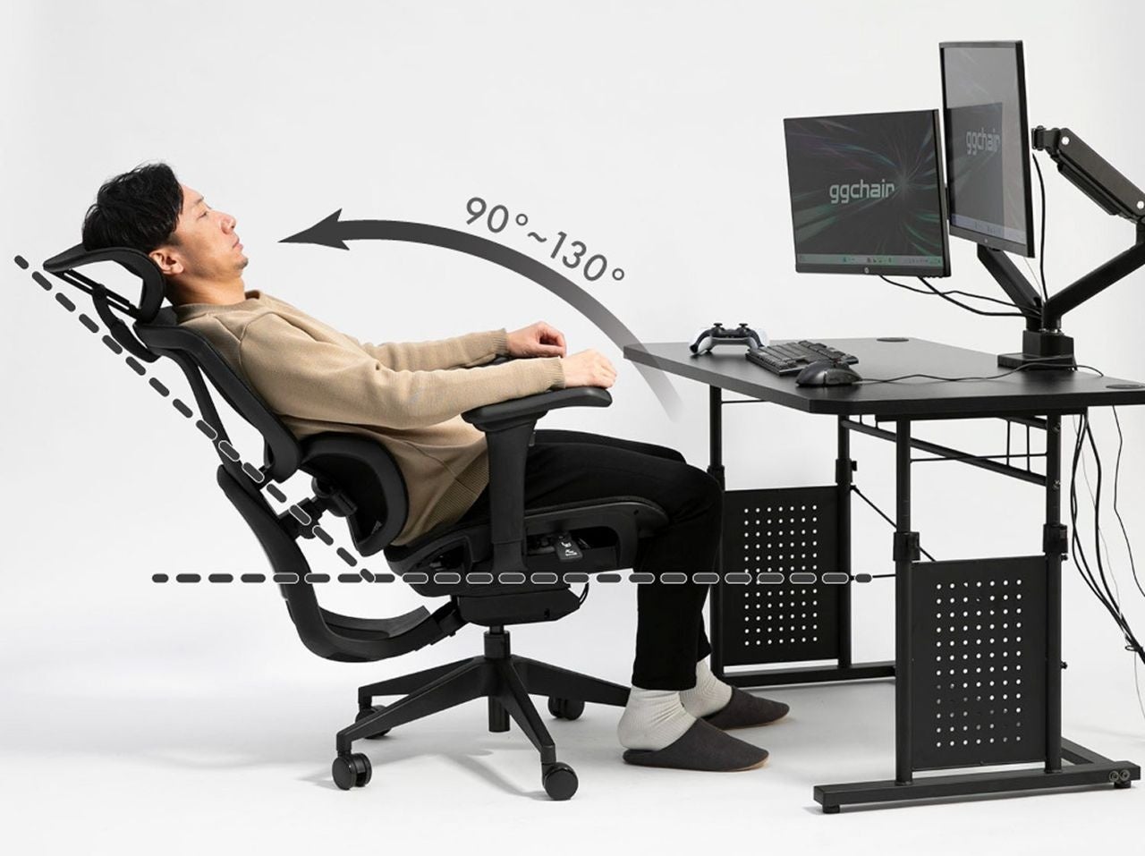 ■休憩時もしっかり休める130°リクライニング90~130°の範囲で調節可能なリクライニング搭載。プレイの間の休憩時などに体を預け、ゆったりと座ることができます。背面も蒸れにくいメッシュ生地を使用しています。