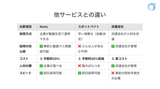 ・動画プロフィールによるマッチング:求職者の接客スキルや言語能力を事前に確認可能で、企業は事前に適切な人材を選考できるため、当日どのような人材が来るのかという不安がありません。
