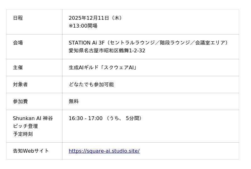 Shunkan AI 取締役CTO 神谷が、12月10日(火)に名古屋・STATION Aiで開催される 「生成AIギルド『スクウェアAI』大感謝祭」 にてピッチ登壇いたします。「AI適応開発」に関心をお持ちの方、あるいは現場でのAI活用にお悩みの方は、ぜひ会場にてお声がけください。