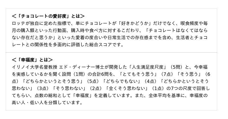 株式会社ロッテ(本社:東京都新宿区、代表取締役社長執行役員:中島英樹、以下ロッテ)は、全国の20~60代男女4,700名(各都道府県100名ずつ)を対象に、チョコレートの食べ方や好みの傾向及びチョコレートへの向き合い方と幸福度の関係性を明らかにする「全国チョコレート調査2025」を実施しました。この度、当社独自の指標を用いて定めた“チョコレート愛好度”の全国偏差値ランキングを公開いたします。「チョコレートの愛好度」と「幸福度」の関係性を分析したところ、幸せを感じやすい都道府県民のチョコレートの“食べ方”や“楽しみ方”には、「午前の休憩」「仕事や家事の後」「夕食後」など共通する特徴があることがわかりました。