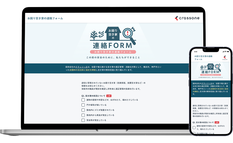 - 住民が近隣の迷惑な空き家について自治体へ通報できる「お困り空き家の連絡フォーム」を導入 (松田町版URL:https://www.crassone.jp/simulator/akiya-contact-form/kanagawa/ashigarakamigummatsudamachi