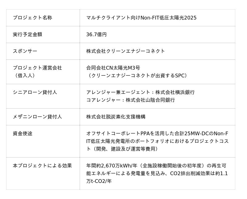 脱炭素経営企業、RE100参加企業等のお客様に対してNon-FIT太陽光発電によるグリーン電力と環境価値をお届けする株式会社クリーンエナジーコネクト(代表取締役:内田鉄平、以下「クリーンエナジーコネクト」)は、オフサイトコーポレートPPAのプロジェクトにおける25MW-DCのNon-FIT低圧太陽光発電所の開発のため、株式会社横浜銀行・株式会社山陰合同銀行、および株式会社脱炭素化支援機構(JICN)から、プロジェクトファイナンスにより総額36.7億円の資金調達を実施したことをお知らせいたします。