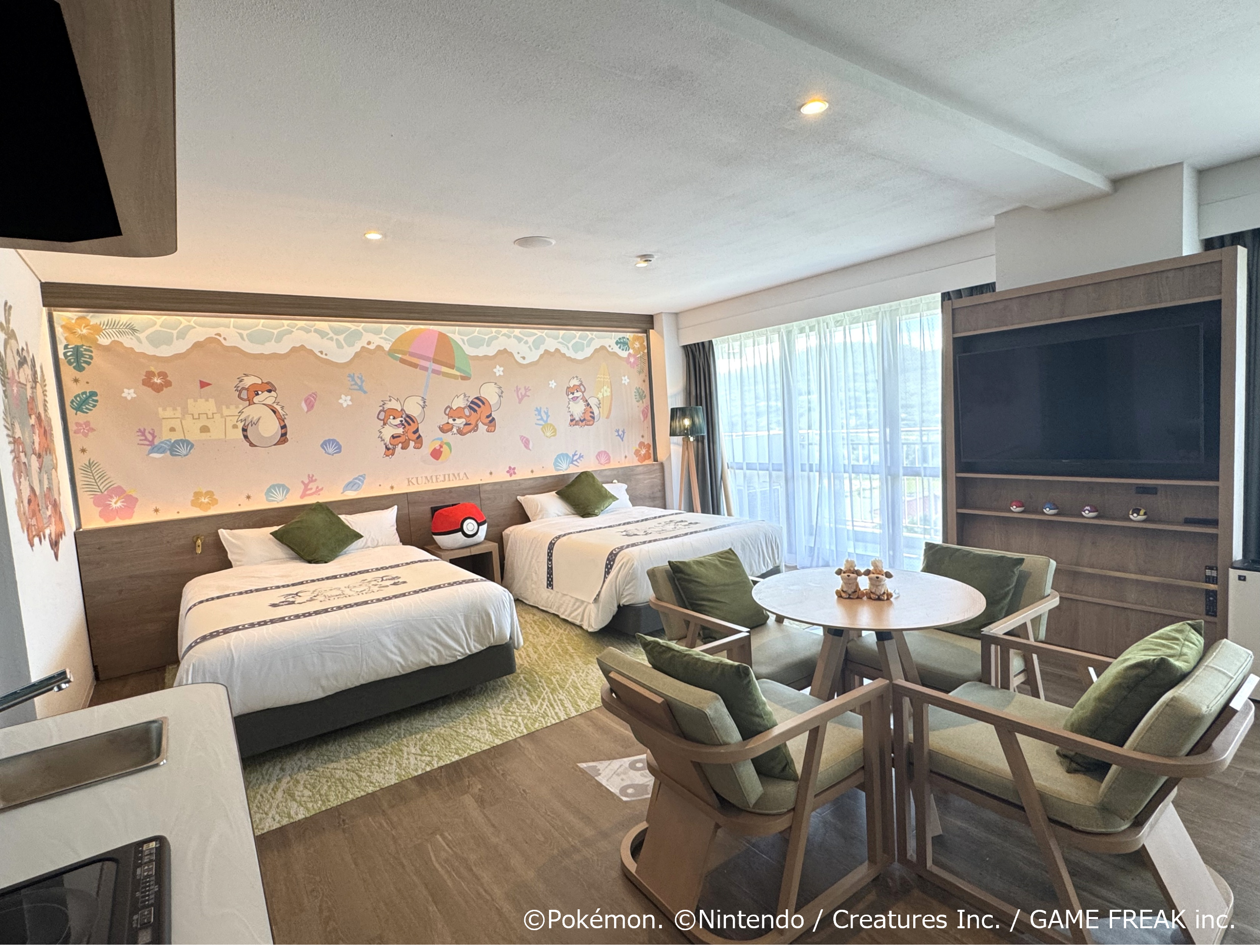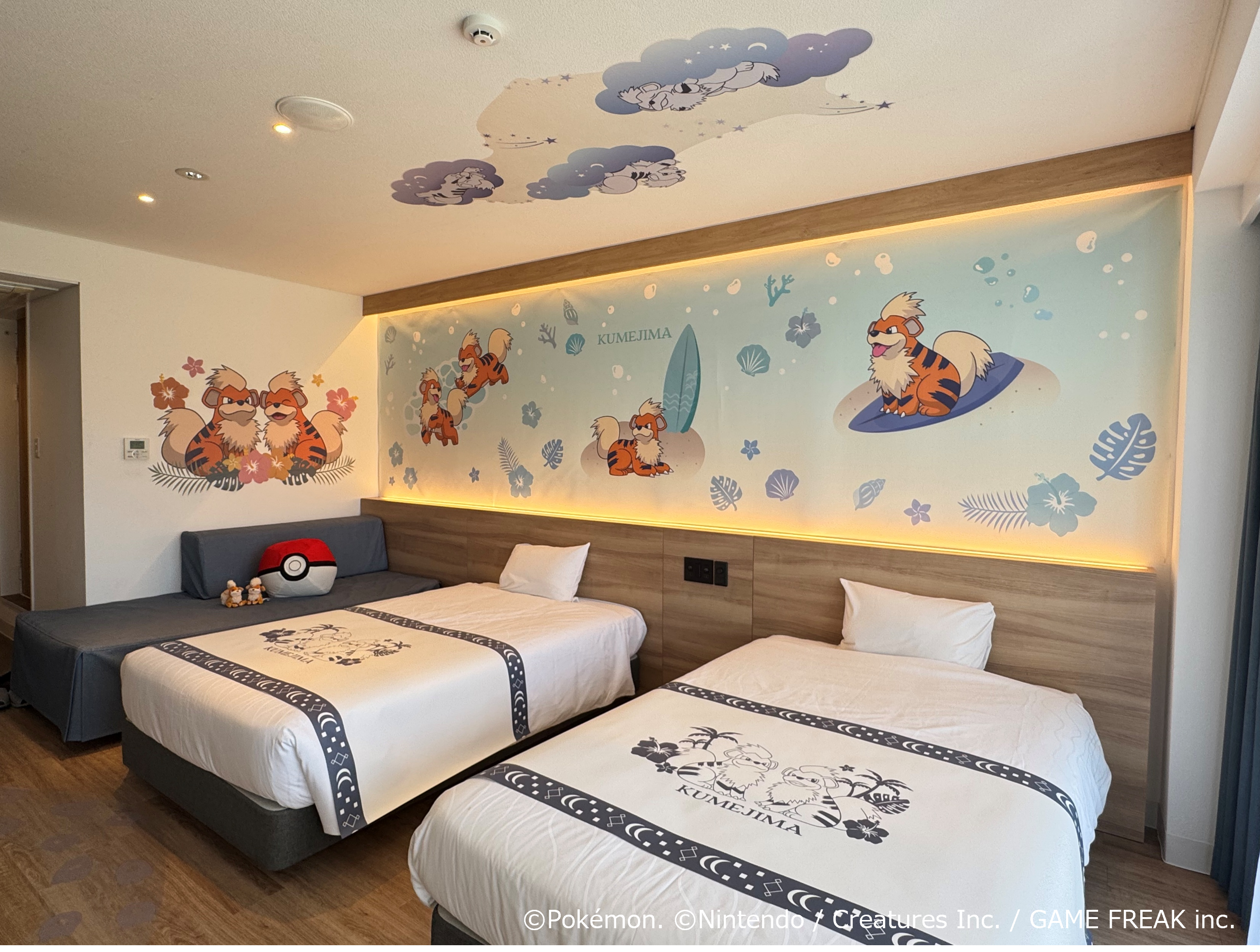 自治体ごとに選ばれた「推しポケモン」が、地域の魅力を国内外に発信する「ポケモンローカルActs」にて、こいぬポケモンの「ガーディ」が「おきなわ応援ポケモン」として活躍しています。ホテルが立地する久米島町でも、ポケモンの絵が描かれたマンホール蓋の「ポケふた」が展開されています。そこで、沖縄県や久米島の魅力をホテルからも発信したいと考え、このたび、ウォーターマークホテル沖縄 久米アイランドでは、沖縄県のホテルとしては初めて、ガーディとコラボレーションした、「ガーディコラボルーム」を12月5日(金)より発売します。