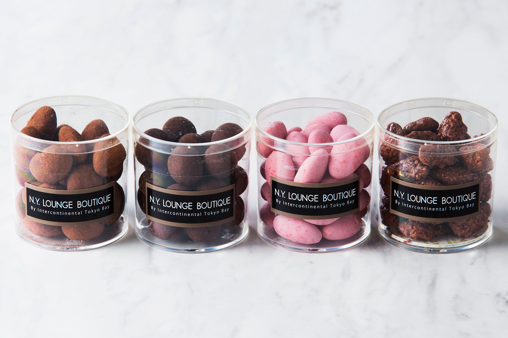 左からアマンドショコラ、ノワゼットショコラ、ストロベリーショコラ、プラリーヌアマンド