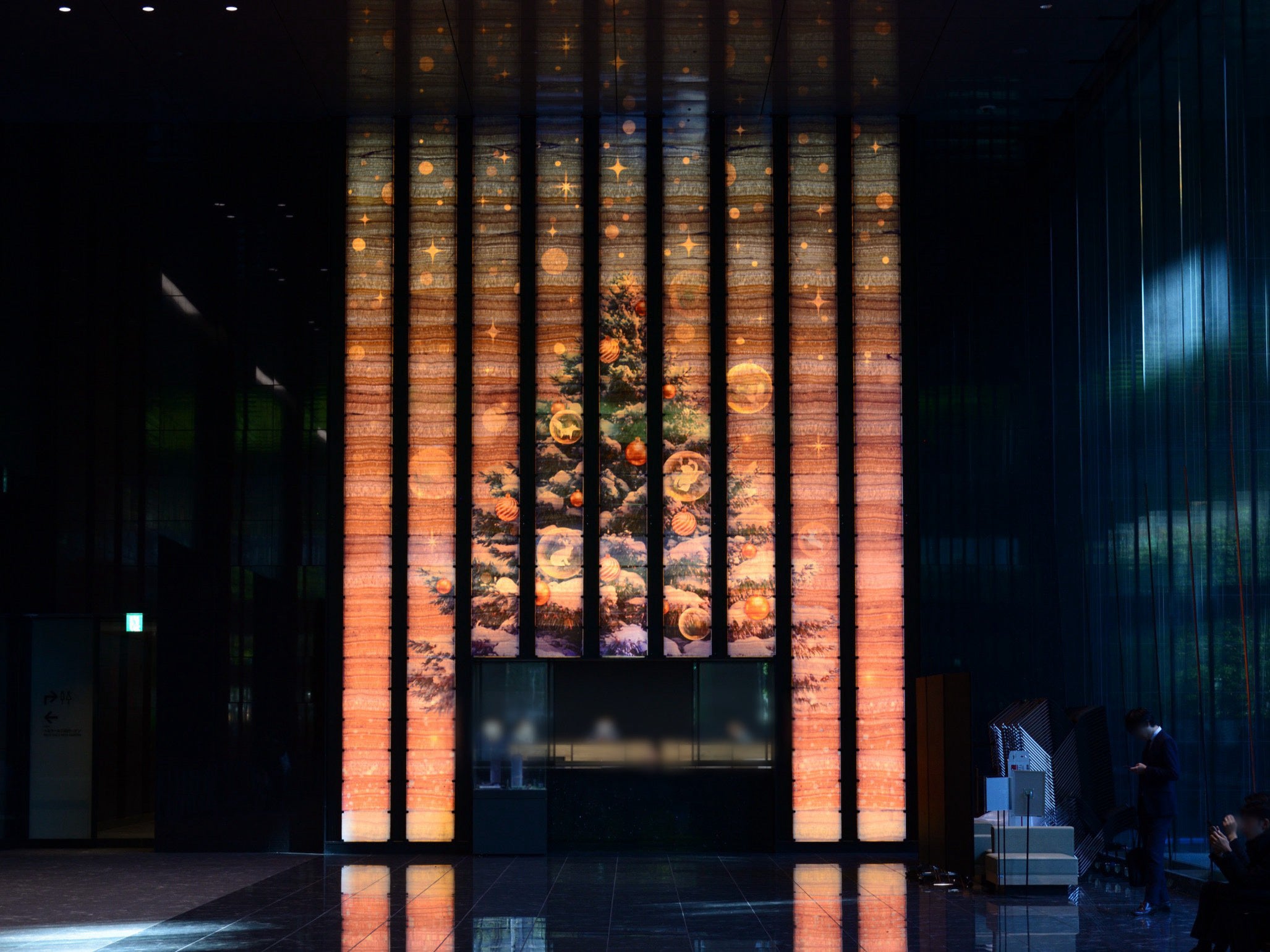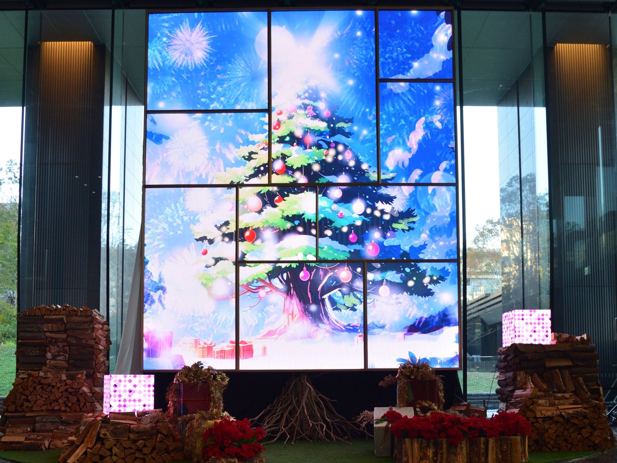 本イベントは、地域社会への貢献と、オフィスビルにお勤めの方や近隣にお住まいの方への特別なクリスマス体験の提供を目的としています。今回、日比谷花壇は、従来のクリスマスツリーの概念を超えた高さ7mにおよぶ「LEDパネルツリー」のデザインから施工、アニメーション制作、壁面ラッピングに至るまで、空間全体のトータルプロデュースを担当しました。