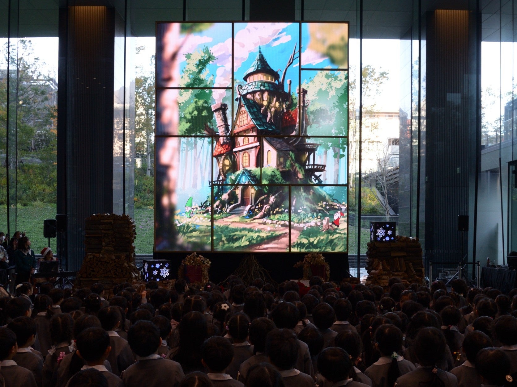 イベント当日、園児たちの魔法の掛け声によってLEDパネルツリーが鮮やかに点灯すると、大歓声とともに会場全体が幻想的な光に包まれました。その後、館内に響き渡る園児たちの「ジングルベル」の大合唱が行われ、ツリーのパネルには、両社で企画・制作した「クリスマスファンタジー」をテーマにしたオリジナルアニメーションが映し出されました。光と映像が融合したダイナミックな演出は、来場された方々を魅了し、会場は笑顔であふれ、子どもたちにとって特別な一日となりました。