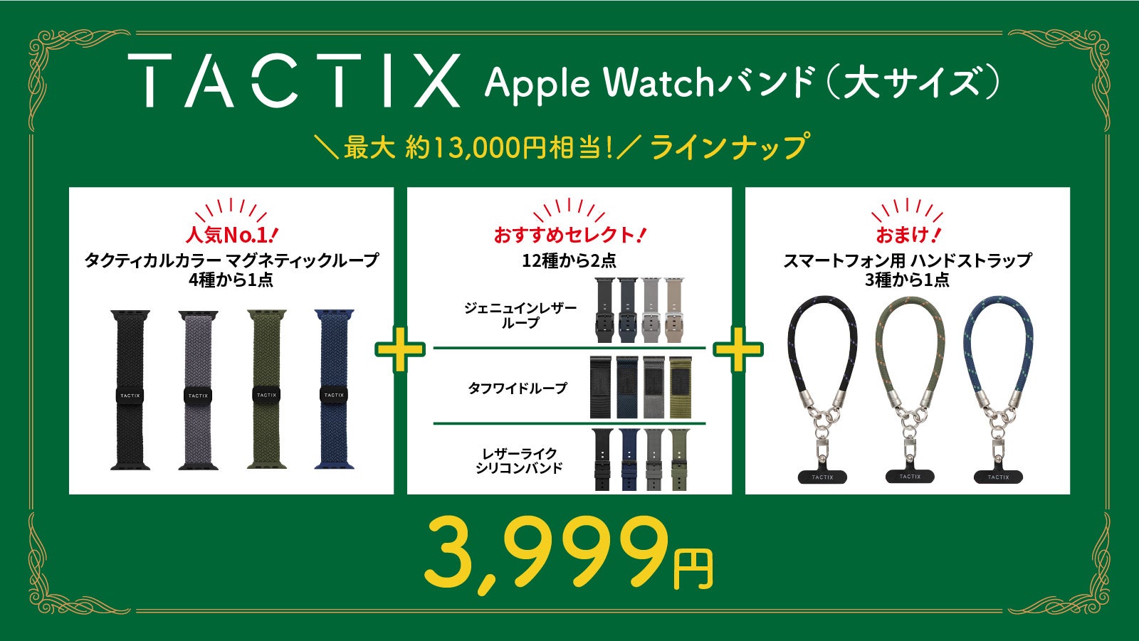 今回販売するクリスマス福袋は、上品なニュアンスカラーで高見えする「Mignonne(ミニョン)」、タクティカルカラーでコーディネートしやすい「TACTIX(タクトナイン)」の2ブランドから、小サイズ(38/40/41/42mm)および大サイズ(44/45/46/49mm)に対応した計3種類をラインアップ。セットには人気No.1バンド「マグネティックループ」が必ず1点含まれ、さらにおすすめバンド2点+おまけ付きで最大 約13,000円相当の商品が入っており、自分へのご褒美やクリスマスギフトにも最適な期間限定企画です。