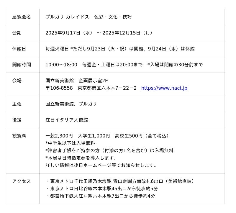 展覧会ホームページ: https://www.bulgari.com/ja-jp/stories/kaleidos-exhibition