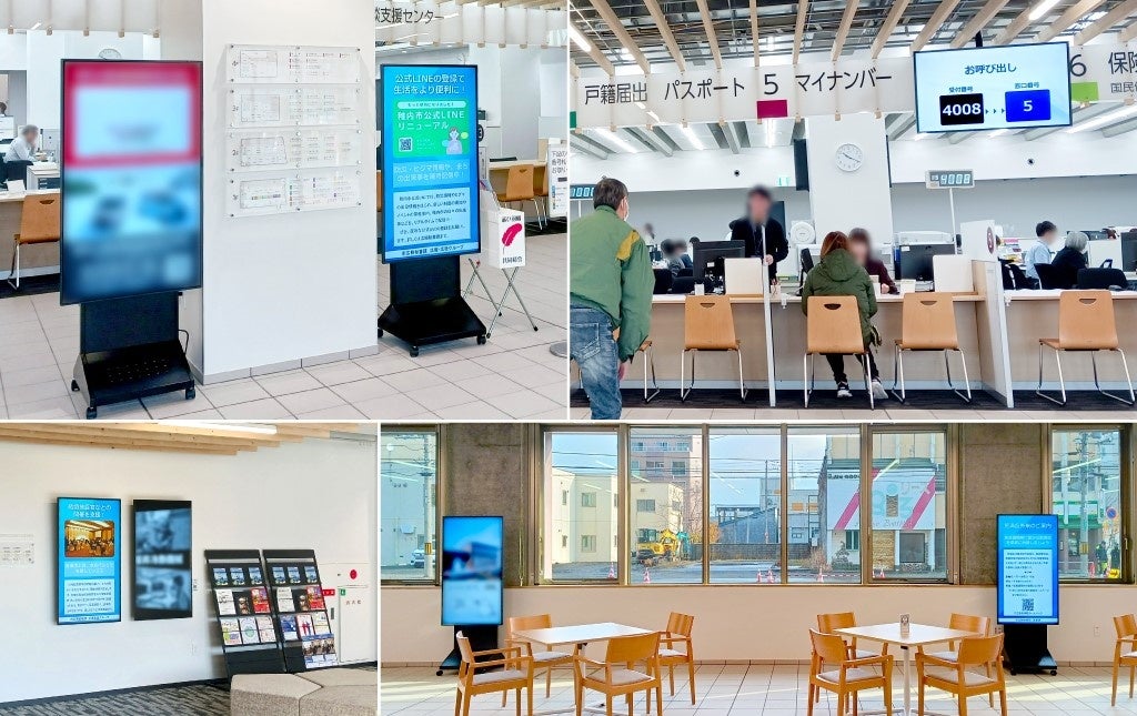 このような状況のもと、自治体に向けたソリューションを一層拡大すべく、自治体新庁舎(またはリニューアル)をターゲットとした総合的な公共施設向けデジタルサイネージ運用・設置支援を推進しており、本件もその取り組みの一環として実施したものとなります。庁舎内の総合案内や行政情報の発信に加え、番号案内事業との連携により、窓口案内やフロア誘導を効率化。これにより、来庁者の動線改善や地域情報提供など、公共サービス全体の質の向上に寄与しています。