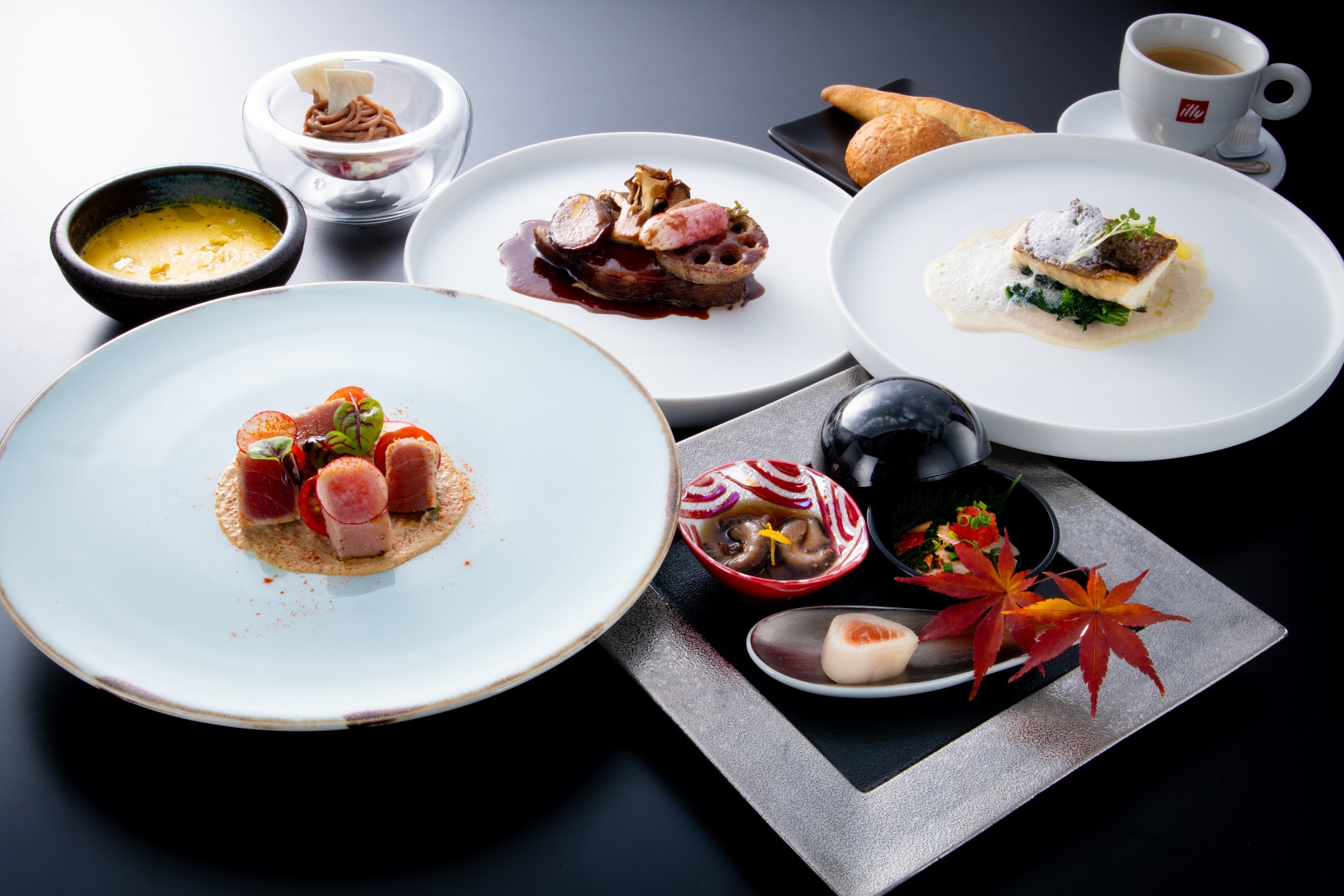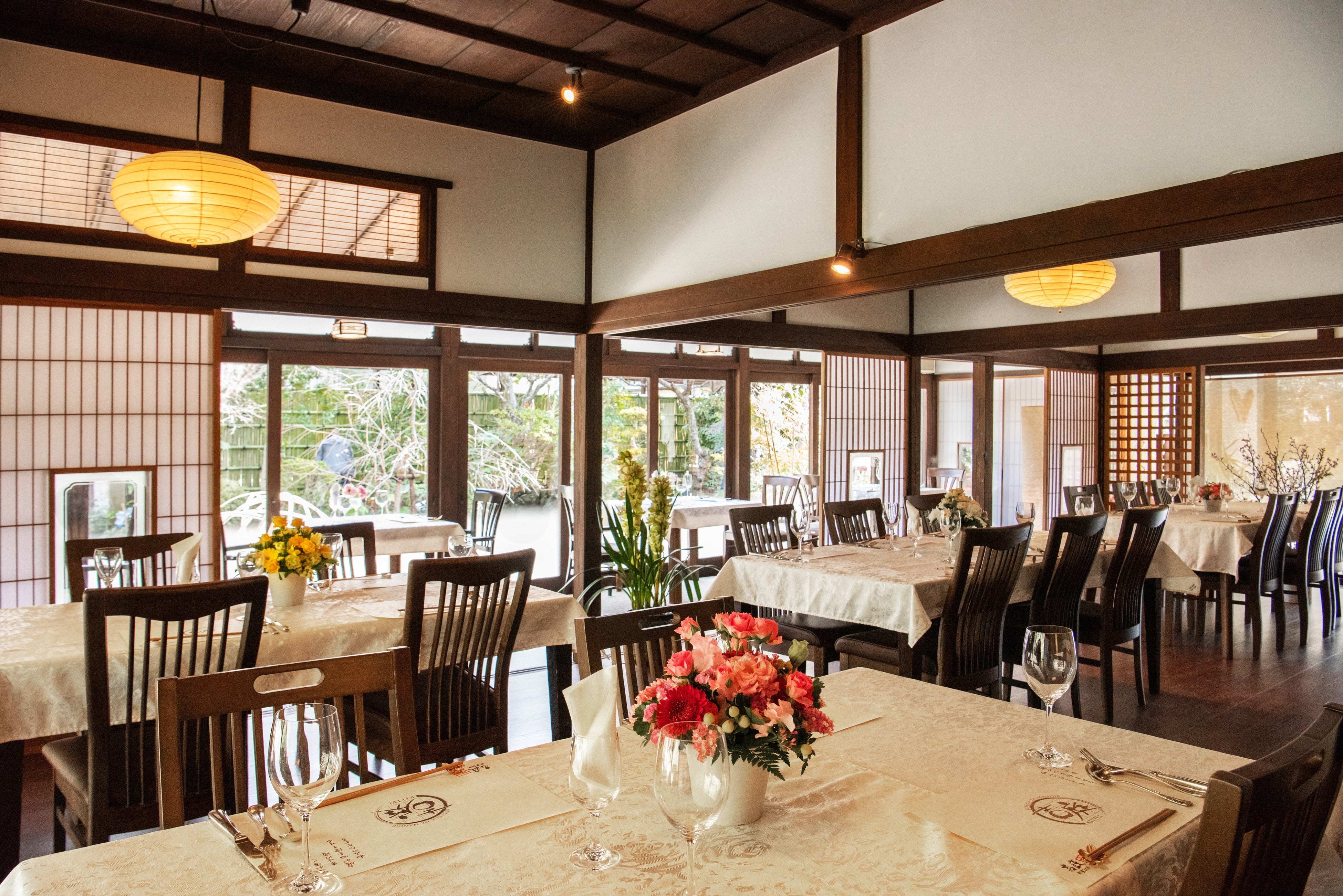 店内では、地元食材を生かした季節替わりの創作和フレンチをご提供。四季折々の庭園の景色とともに、落ち着いたひとときをお過ごしいただけます。