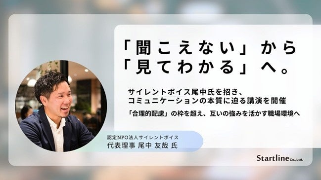 障害者就業支援を通じて“誰もが自分らしく生きる社会”を目指す株式会社スタートライン (本社:東京都三鷹市、代表取締役社長:西村賢治)は、2025年11月5日(火)に、社員の障害理解を深め、より質の高い支援とインクルーシブな職場環境を実現するため、認定NPO法人サイレントボイス 代表理事 尾中 友哉氏をお招きし、社内オンライン講演会を開催いたしました。