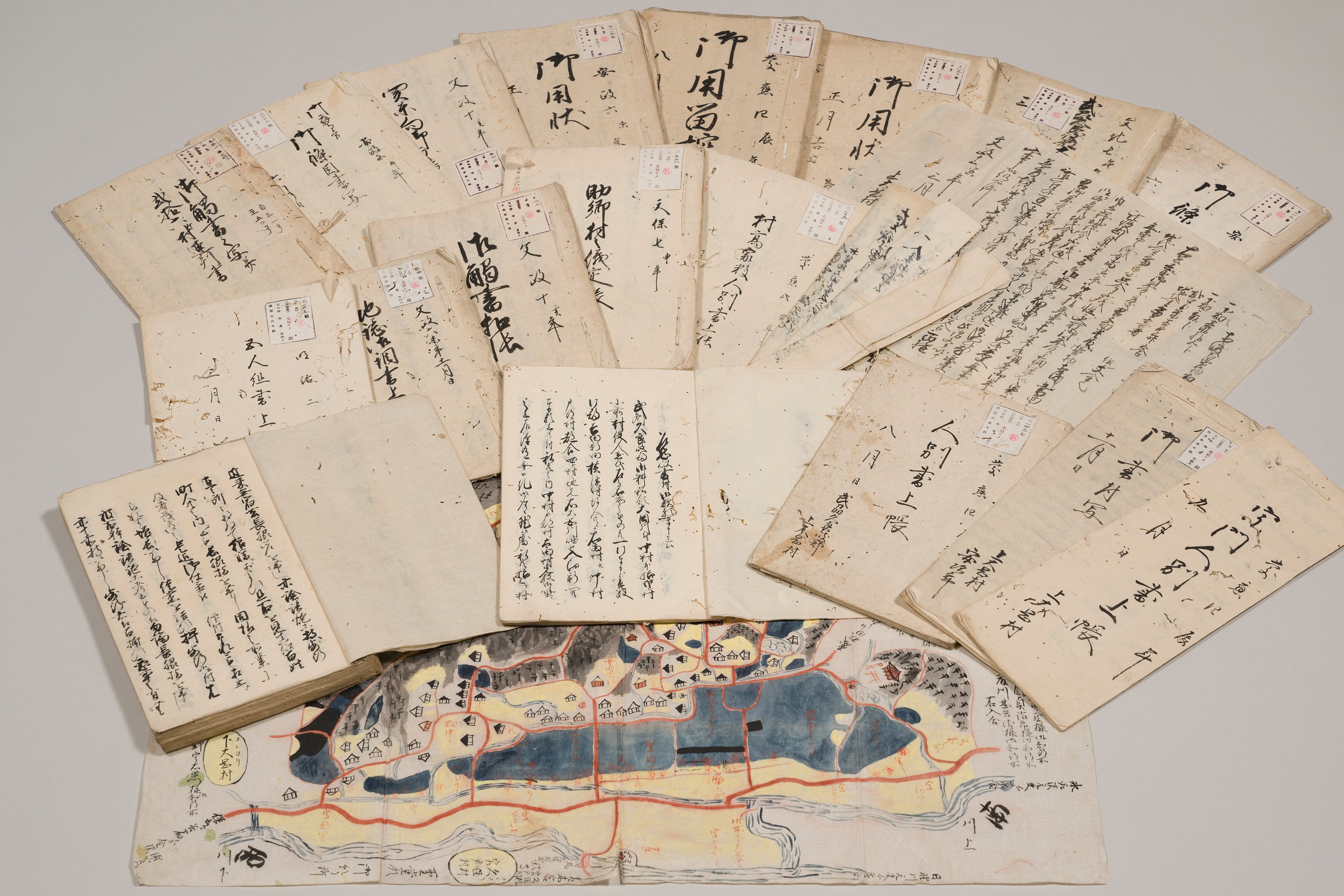 上大岡村(現、横浜市港南区)で名主を務めた北見家に伝来した古文書群(一部)(当館所蔵)。