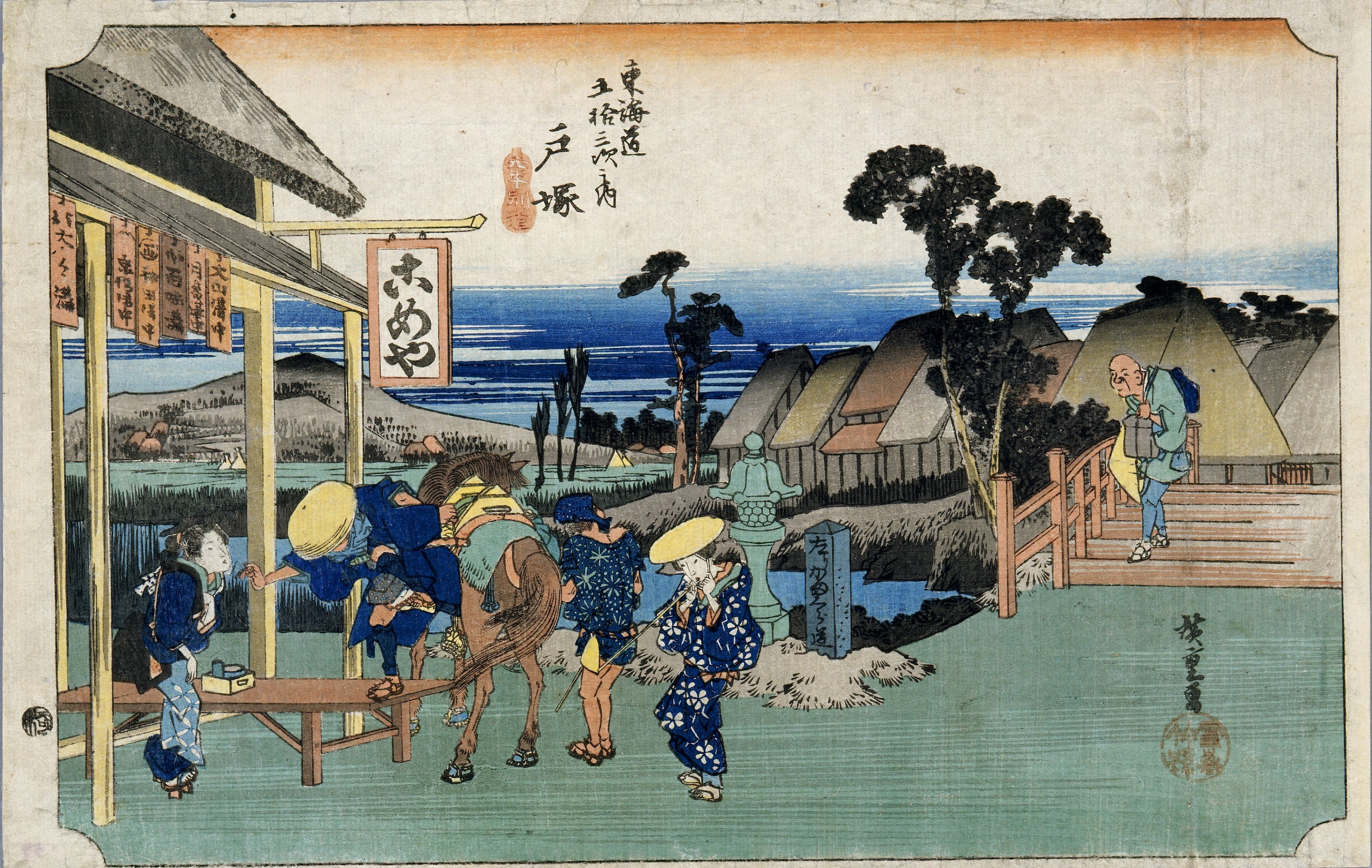 「東海道五拾三次之内 戸塚」(当館所蔵)。軒先の看板には「こめや」と記されている。